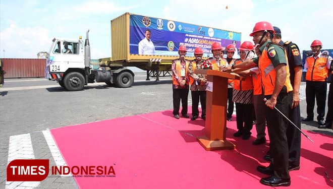 TIMES Banjarbaru/Gubernur Jawa Timur. Dra. Hj. Khofifah Indar Parawansa saat melepas ekspor komoditi pertanian di Terminal PetikEmas Surabaya (TPS). Kamis (21/3/2019). (FOTO: TIM Media For TIMES Indonesia)