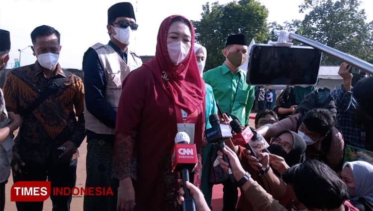 TIMES Banjarbaru/Putri Abdurrahman Wahid (Gus Dur) Yeny Wahid saat diwawancarai oleh awak media. (FOTO: Moh Ramli/TIMES Indonesia)
