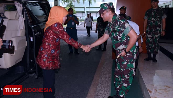 TIMES Banjarbaru/Pangdam V/Brawijaya, Mayjen TNI Wisnoe, P.B, menyambut kedatangan Gubernur Jatim, Khofifah Indar Parawansa di Makodam V/Brawijaya, Rabu (20/2/2019).(Foto: Istimewa)